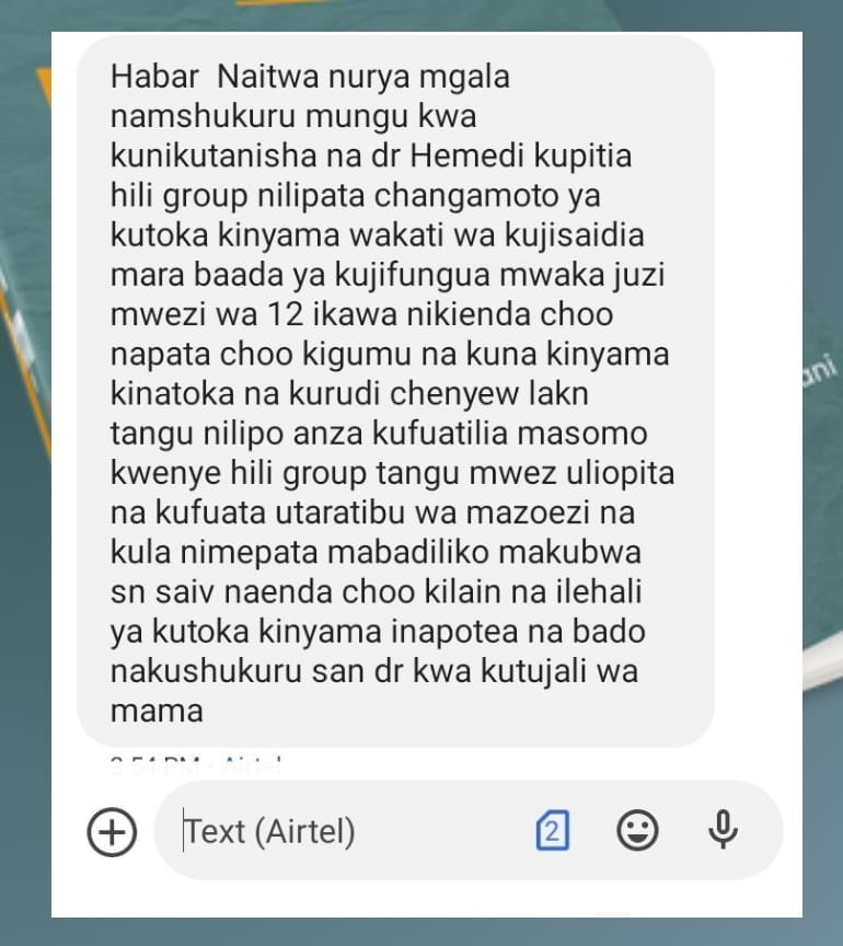 "Binafsi namshukuru Mungu mwingi wa rehma kwa kunifanya nijiunge na kundi hili. Nimetendewa maajabu kwa ugonjwa wa bawasiri.
